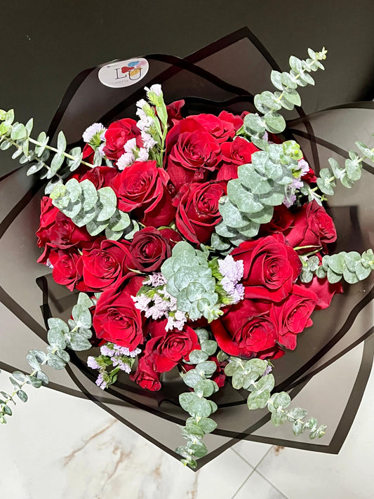 Arreglo rosas rojas con follaje