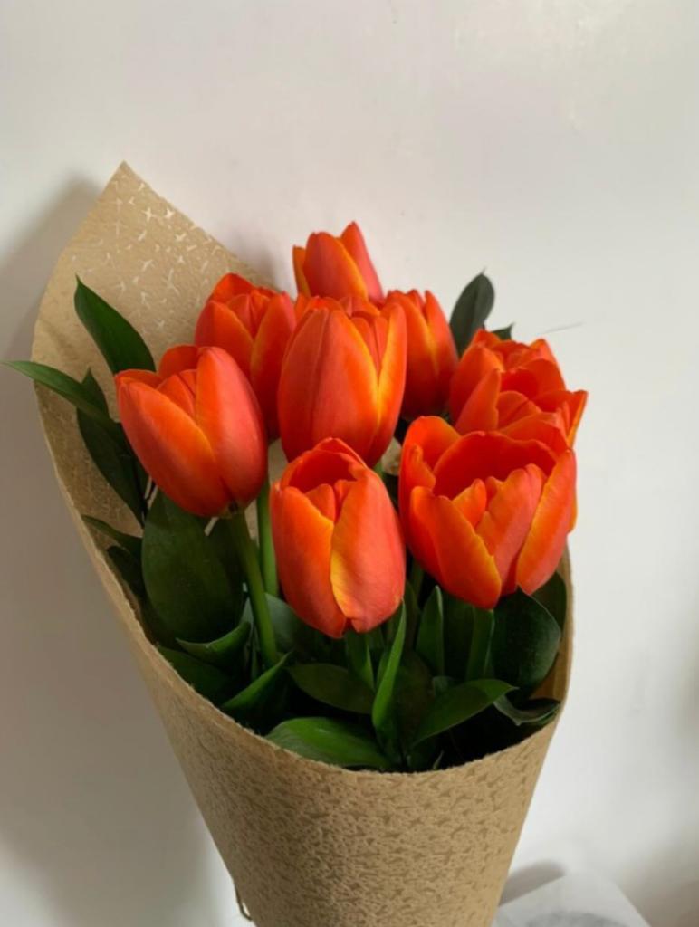 Tulipanes color Naranja con follaje. Envuelto en papel